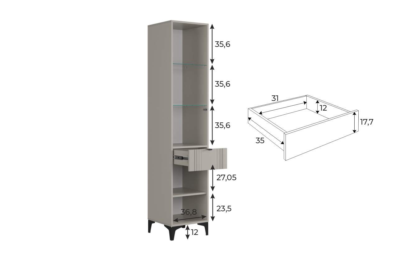 Шкаф оснащён надёжной металлической ручкой и имеет удобное внутреннее наполнение: надёжные полки за стеклянной и глухой дверцами, а также выкатной ящик. Это позволяет рационально использовать пространство.