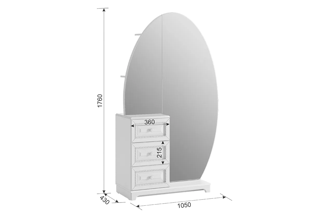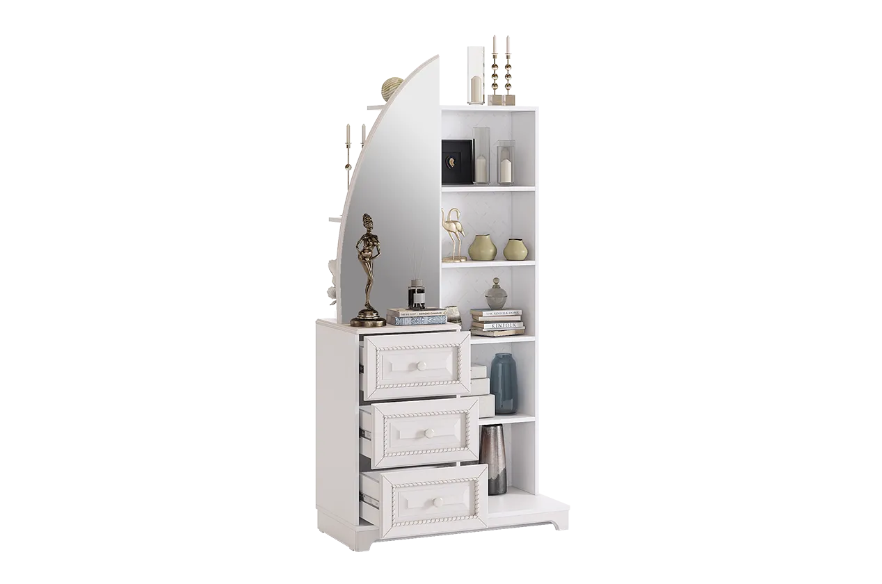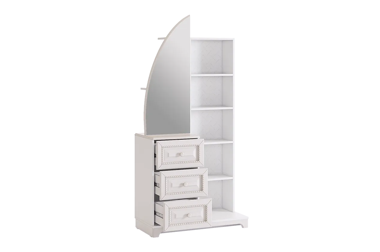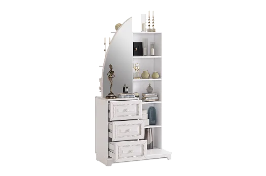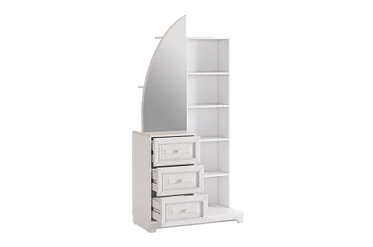 Состоит из: 3-х выдвижных ящиков, зеркала, стеллажа с полками, расположенный за зеркалом.