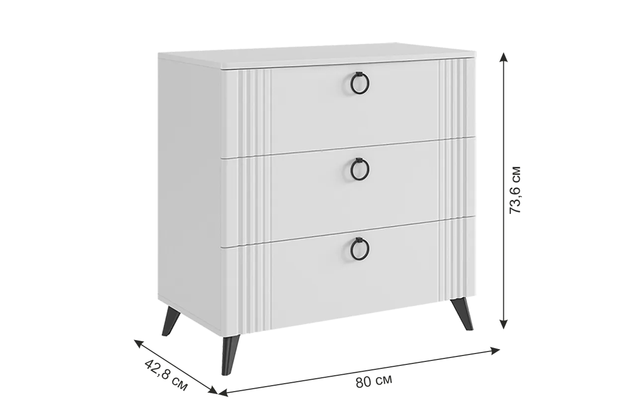 Комод "Ева" идеально сочетает в себе стиль и функциональность. С его размерами 800х428х736 мм он будет отличным дополнением к любому интерьеру. Корпус комода выполнен из ЛДСП в белом деревянном цвете, а фасады - из МДФ, облицованного пленкой ПВХ белого матового цвета. Смело можно сказать, что комод выглядит элегантно. Он оснащен тремя просторными ящиками на шариковых направляющих, что обеспечивает плавное и бесшумное скольжение. Удобные ручки-кнопки добавляют комоду элегантности и обеспечивают удобство использования. Также комод имеет бесшумную систему закрытия фасадов, что делает его идеальным выбором для спален или детских комнат. Пластиковые черные опоры высотой 120 мм придают комоду устойчивсть и добавляют удобство уборки. Комод "Ева" - это не просто место для хранения, это изысканный акцент в интерьере вашего дома, который радует своей красотой и функциональностью на протяжении многих лет. Он создает атмосферу уюта и комфорта, идеально сочетаясь с любыми элементами интерьера и придавая вашему дому неповторимый шарм и элегантность.