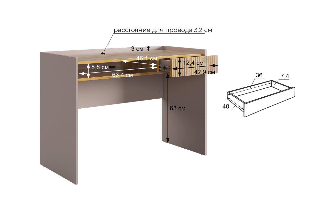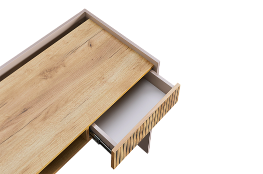 Корпус стола выполнен в цвете кашемир, что придает ему современный и спокойный вид, легко сочетающийся с любым интерьером. Выкатной ящик в цвете "дуб крафт золотой", декорирован принтом, имитирующим вертикальную фрезеровку, что добавляет столу уникальности и роскоши.