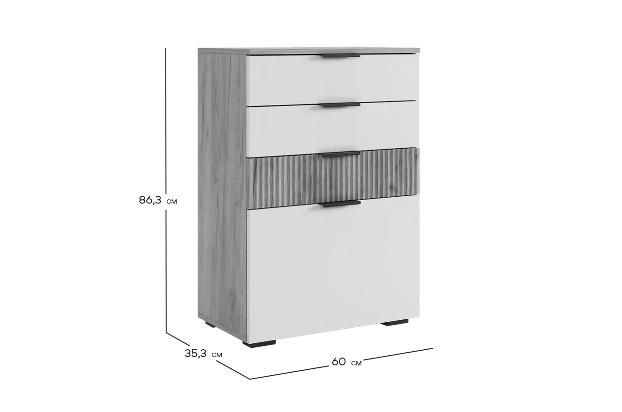 Акцентом в комоде будет МДФ фасад ящика с вертикальной фрезеровкой "Вельвет". Ящики возможно расположить в любой последовательности.