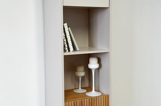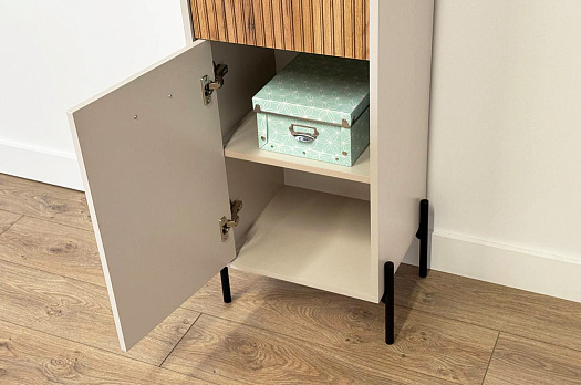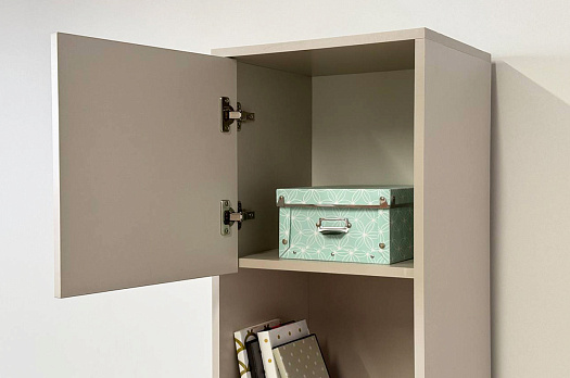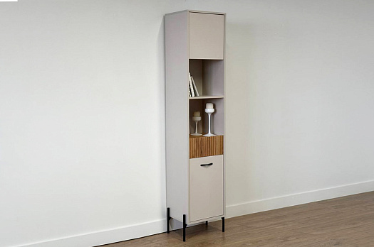 Стеллаж оснащен комбинацией открытых и закрытых полок, что позволяет вам гибко управлять пространством. Открытые полки идеально подходят для демонстрации декоративных предметов или книг, в то время как закрытые полки обеспечивают скрытое пространство для хранения.