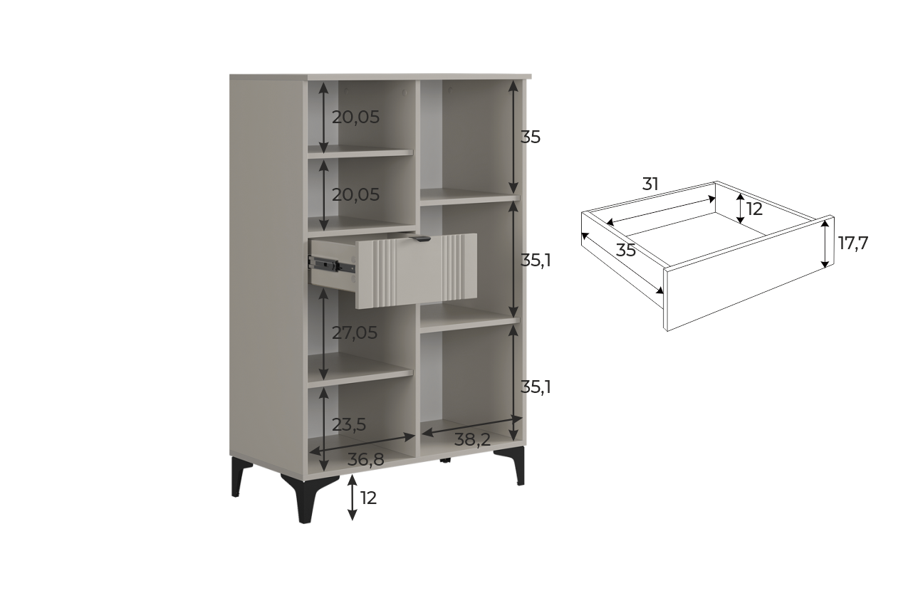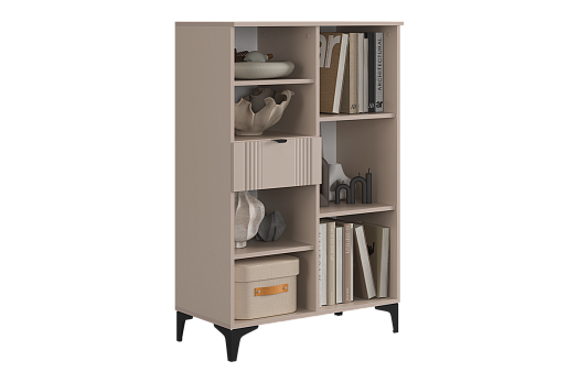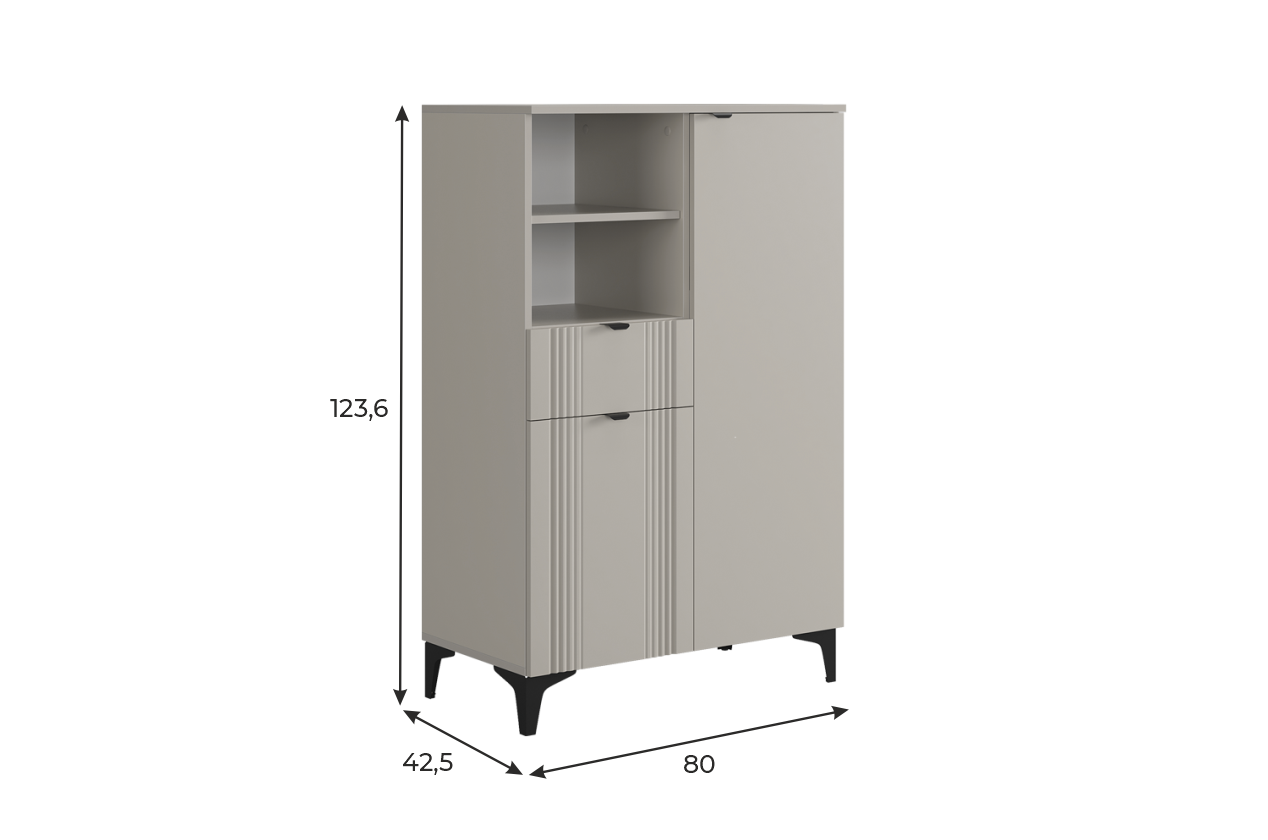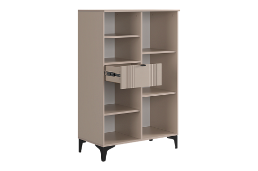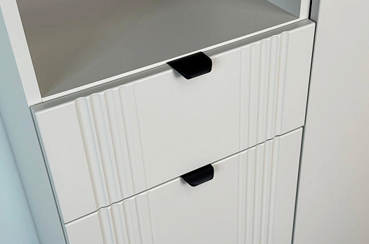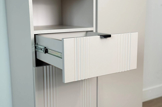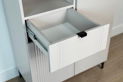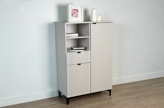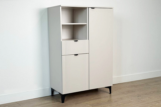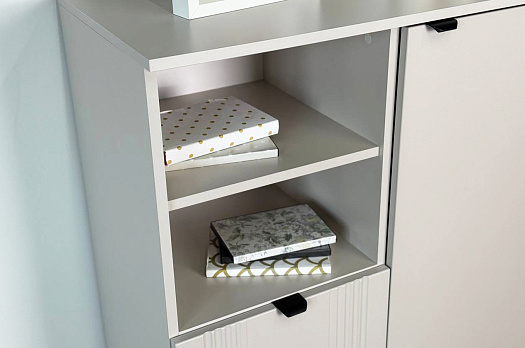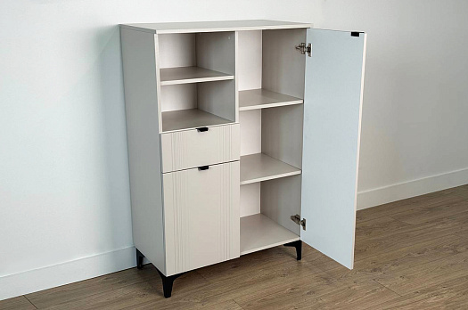 Дизайн комода продуман до мелочей: с одной стороны расположена глухая дверца, за которой скрывается просторное пространство для хранения. С другой стороны – ниша с открытой полкой, выкатной ящик и ещё одна глухая дверца, что позволяет гибко организовать хранение и поддерживать порядок в доме.