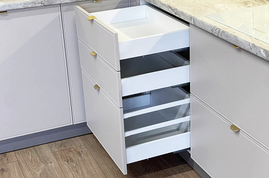 Дополнительно можно комплектовать: лотком для столовых приборов, столешницей, стеновой панелью, объемным плинтусом, стыковочными и торцевыми планками и цельным пластиковым цоколем на весь кухонный гарнитур.