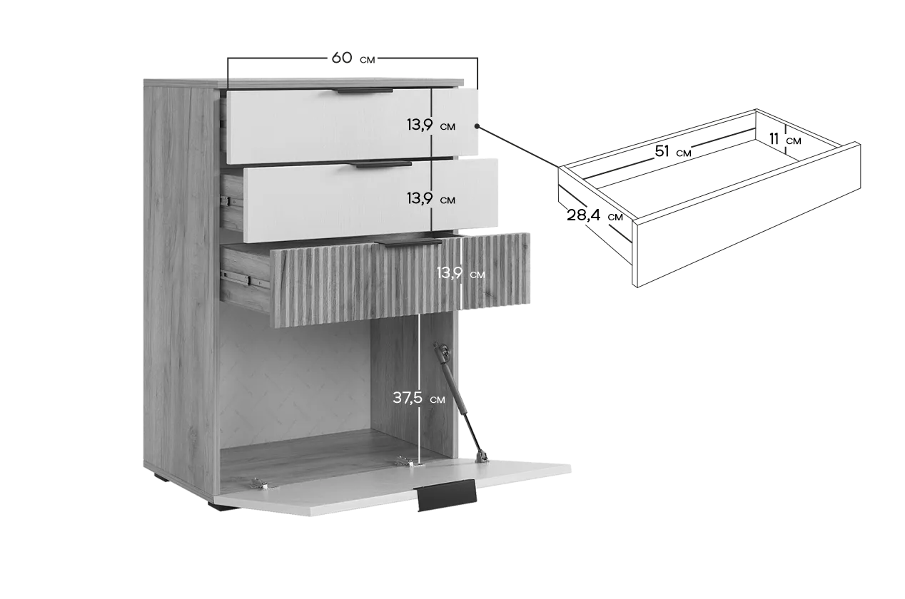 Комод "Бери"- это 3 вместительных ящика и откидная секция снизу, актуальное решение для гостиной, спальни, прихожей, детской и даже кабинета.