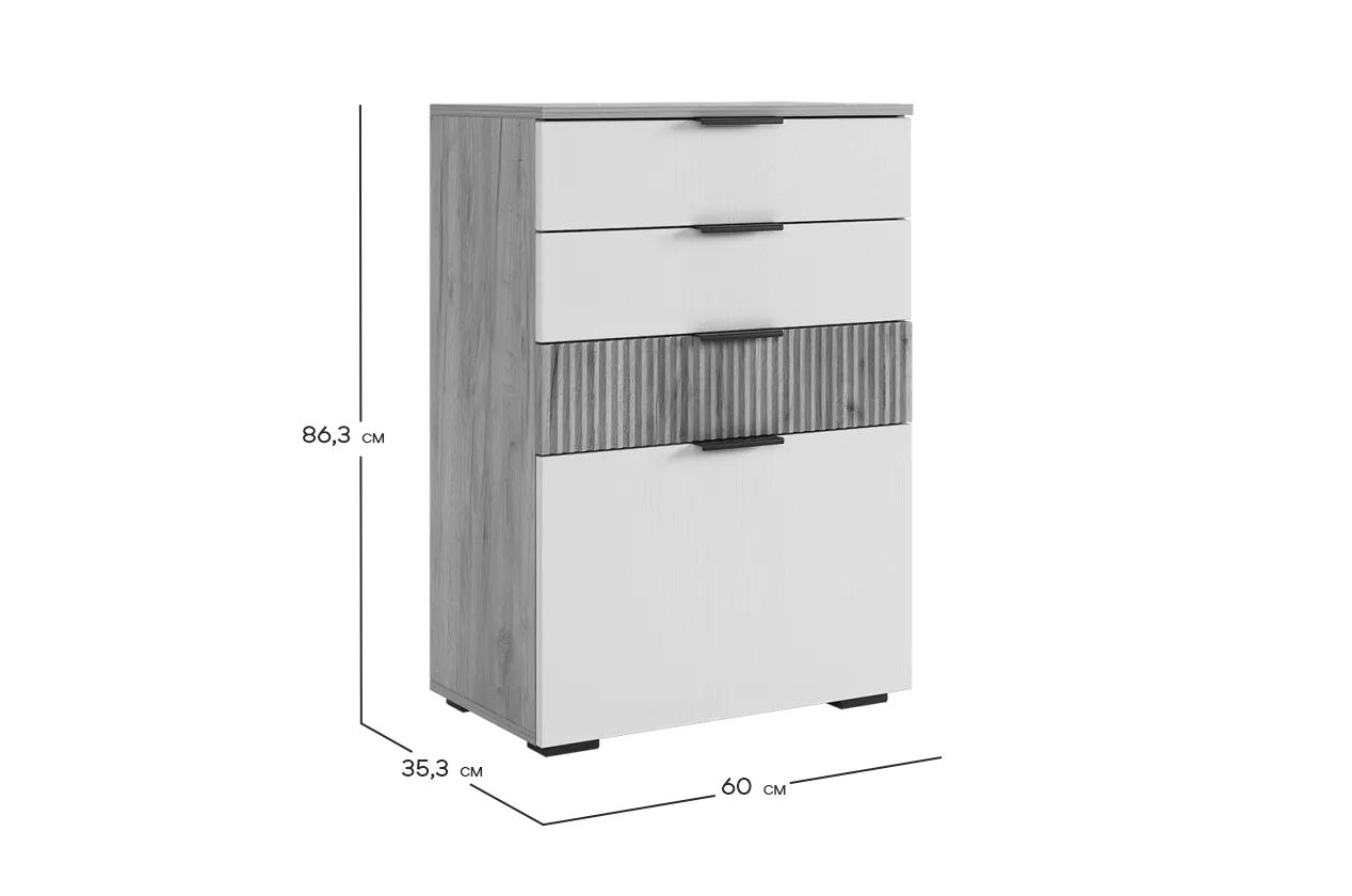 Акцентом в комоде будет МДФ фасад ящика с вертикальной фрезеровкой "Вельвет". Ящики возможно расположить в любой последовательности.