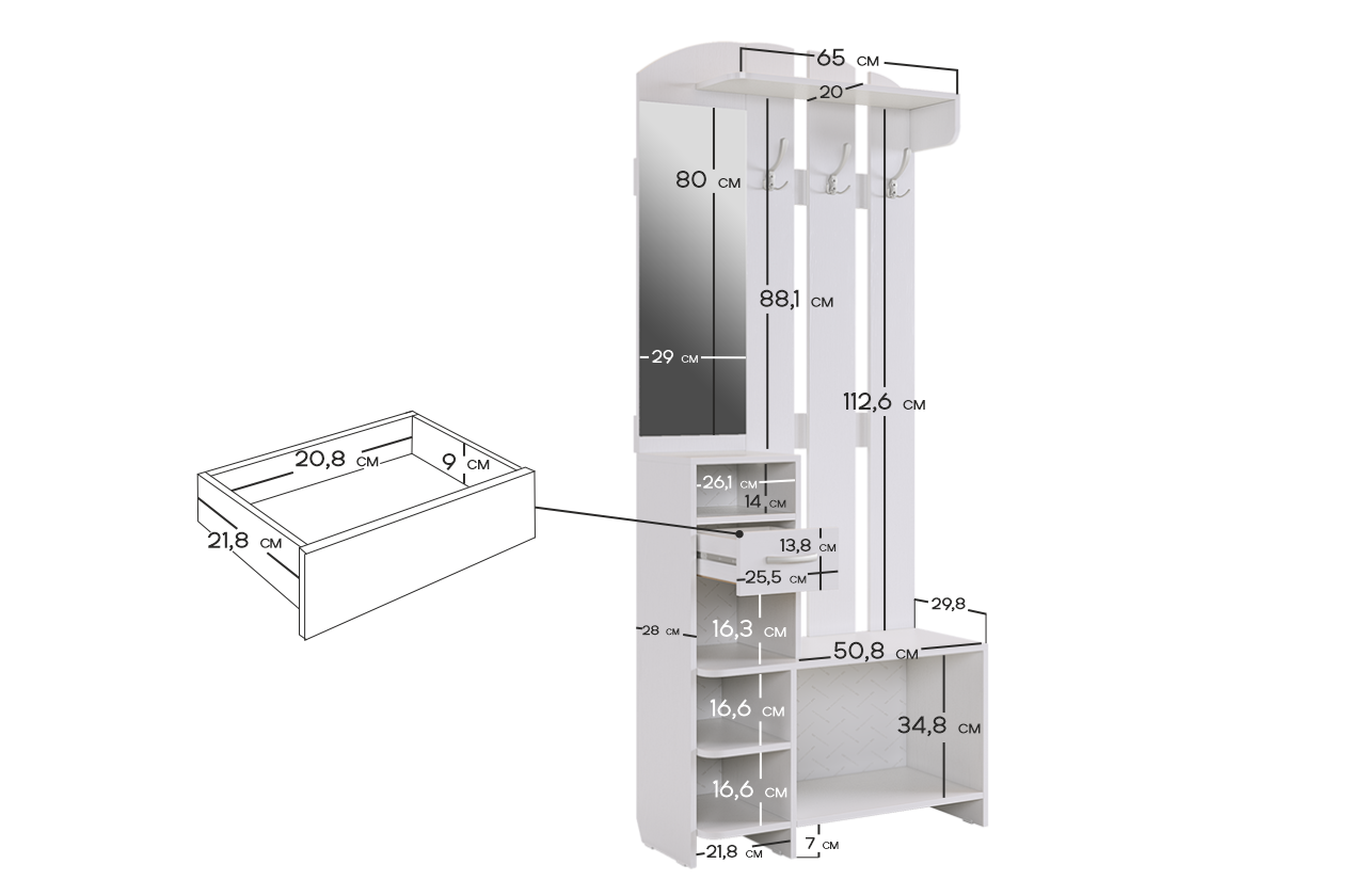 Прихожая Мила: эффективное решение для оптимального использования пространства, сочетающее в себе открытую вешалку с крючками, место для обуви, компактное зеркало и удобный ящик с полочками для всевозможных мелочей.