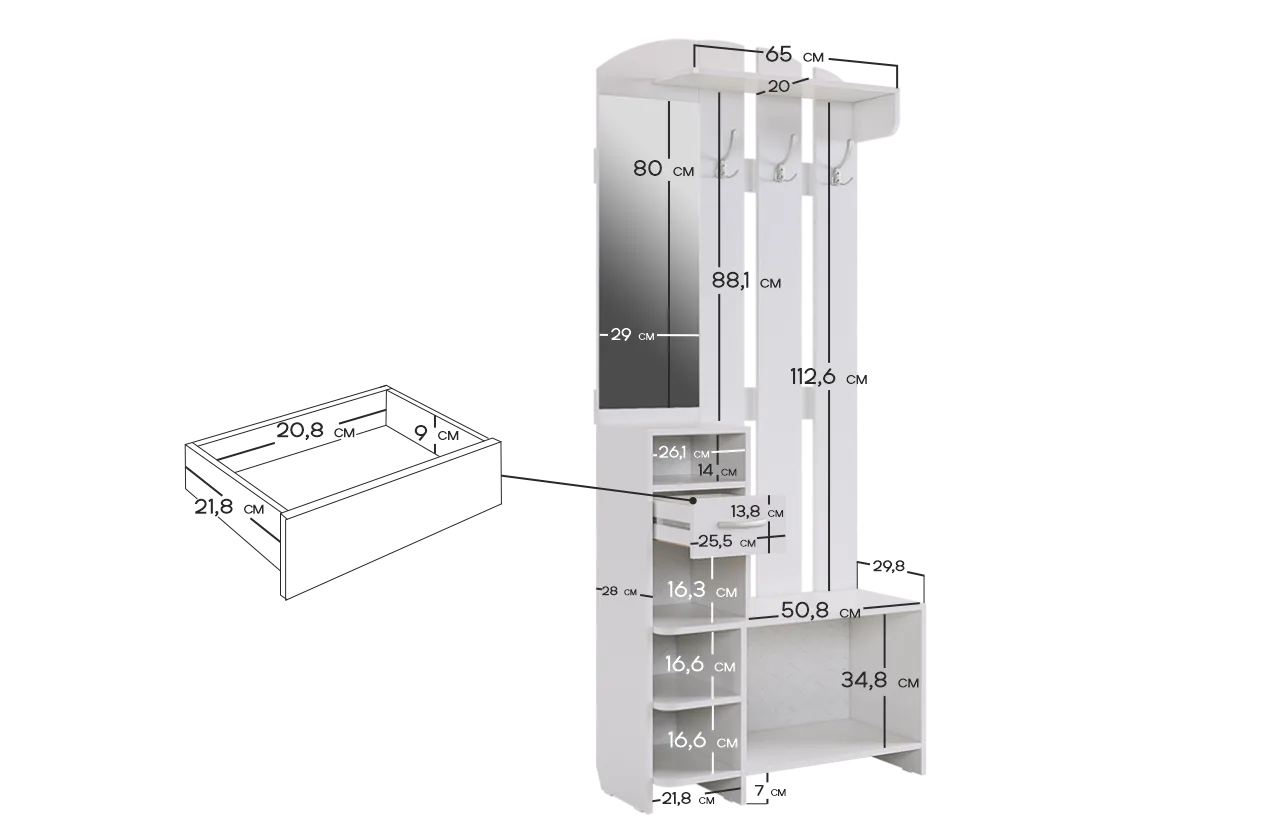 Прихожая Мила: эффективное решение для оптимального использования пространства, сочетающее в себе открытую вешалку с крючками, место для обуви, компактное зеркало и удобный ящик с полочками для всевозможных мелочей.