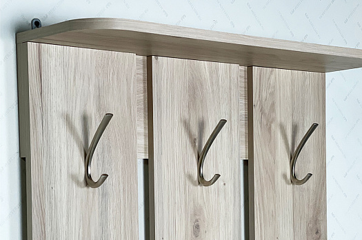 Вешалка Реал 1 - это прекрасное решение для малогабаритных пространств. Отсутствие избыточных деталей и симметричный дизайн делают ее универсальной и адаптируемой к любому интерьеру. На вешалке предусмотрены металлические крючки, которые идеально подойдут для размещения верхней одежды и сумок. Полка сверху предназначена для удобного хранения головных уборов.