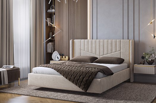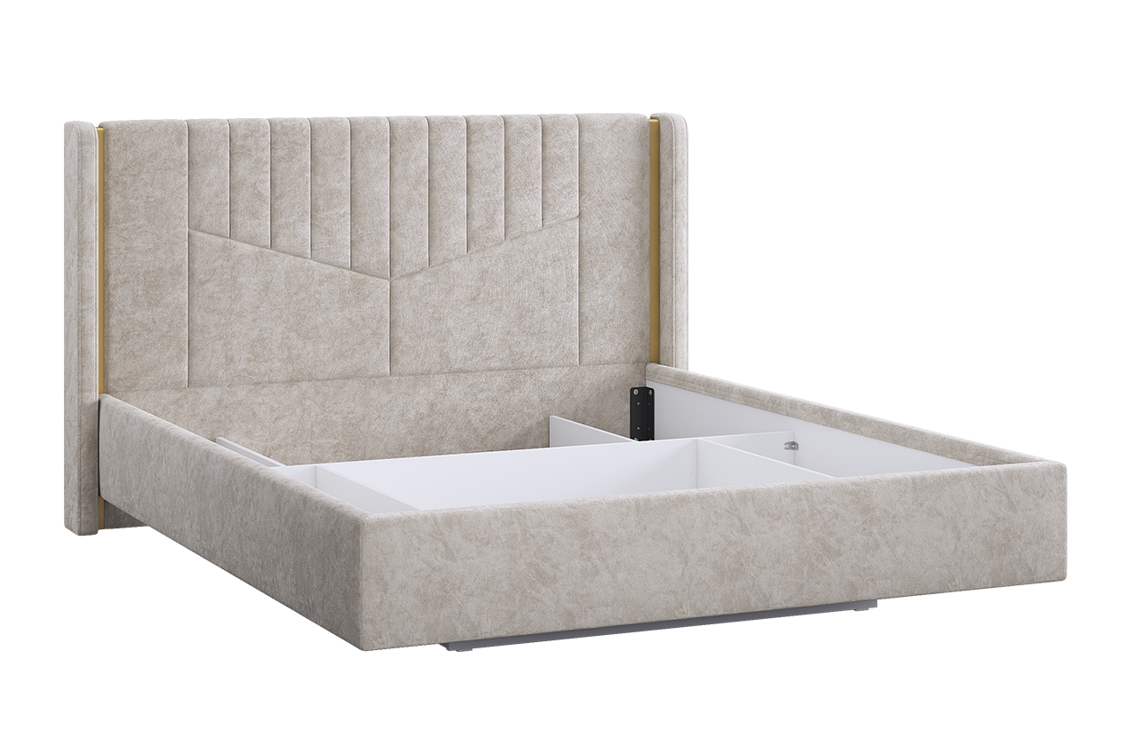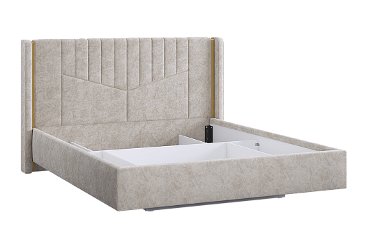 Каркас выглядит аккуратно и визуально лёгким благодаря эффекту "парящей" кровати, что также облегчает уборку - под основание свободно проходит робот-пылесос. Велюр обладает свойствами антипальцы и антикоготь, а съёмный чехол на царгах можно легко снять и очистить при необходимости. Декоративная золотая вставка по бокам изголовья добавляет модели изысканный акцент и делает её выразительным элементом интерьера.
