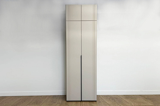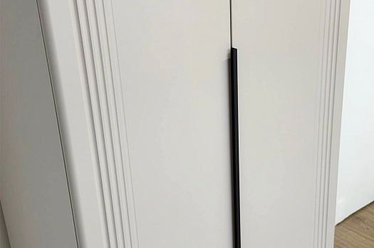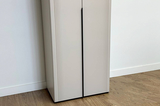 Корпус шкафа изготовлен из ЛДСП, что гарантирует прочность и долговечность. Фасад, покрытый МДФ в плёнке ПВХ, не только выглядит эстетично, но и защищает шкаф от повреждений. Особое внимание заслуживает фрезеровка фасадов, которая придаёт шкафу изысканный вид.
