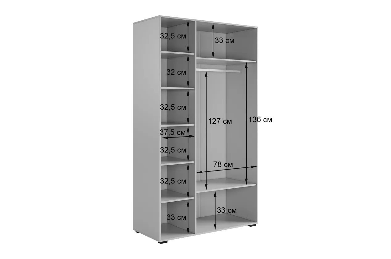 Шкаф имеет удобное наполнение: слева расположены полки для хранения вещей, а справа - штанга для вешалок. Это позволяет рационально использовать пространство и разместить различные типы одежды.