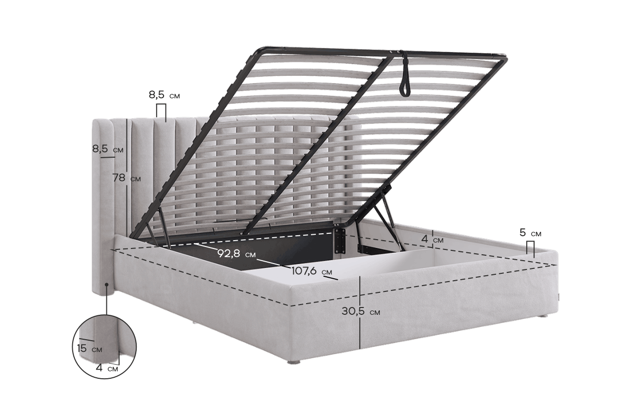 В комплект кровати входит основание с подъемным механизмом, что позволяет вам использовать пространство под кроватью для хранения одежды, постельных принадлежностей и других вещей. Это практичное решение, позволяющее оптимизировать пространство и поддерживать порядок в спальне.